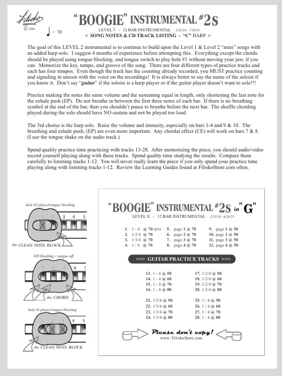The goal of this LEVEL 2 instrumental is to continue to build upon the Level 1 & Level 2 “mini” songs with an added harp solo. I suggest 4 months of experience before attempting this. Everything except the chords should be played using tongue blocking, and tongue switch to play hole #1 without moving your jaw, if you can. Memorize the key, tempo, and groove of the song. There are four different types of practice tracks and each has four tempos.