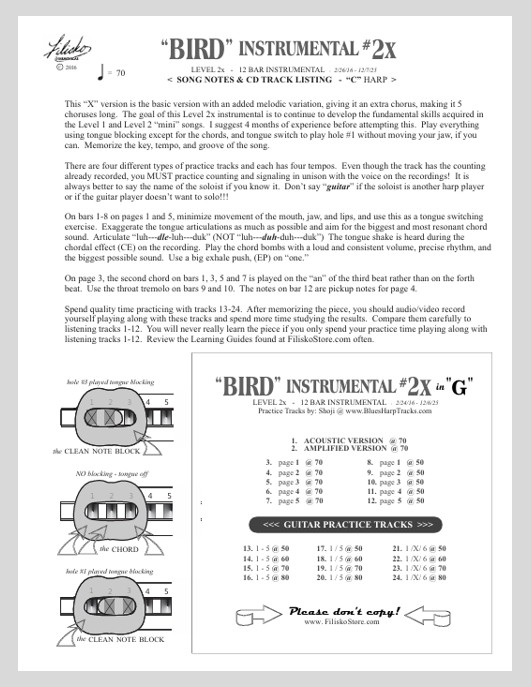 This “X” version is the basic version with an added melodic variation, giving it an extra chorus, making it 5 choruses long. The goal of this Level 2x instrumental is to continue to develop the fundamental skills acquired in the Level 1 and Level 2 “mini” songs. I suggest 4 months of experience before attempting this. Play everything using tongue blocking except for the chords, and tongue switch to play hole #1 without moving your jaw, if you can. Memorize the key, tempo, and groove of the song.