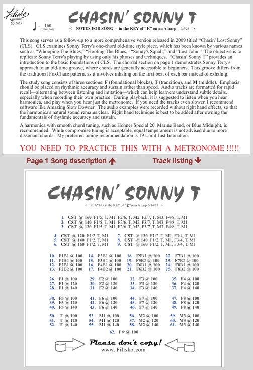 This song serves as a follow-up to a more comprehensive version released in 2009 titled “Chasin' Lost Sonny” (CLS). CLS examines Sonny Terry's one-chord old-time style piece, which has been known by various names such as “Whooping The Blues,” “Hooting The Blues,” “Sonny's Squall,” and “Lost John.” The objective is to replicate Sonny Terry's playing by using only his phrases and techniques. “Chasin’ Sonny T” provides an introduction to the basic foundations of CLS. The chordal section on page 1 demonstrates Sonny Terry's approach to an old-time groove, where chords are generally accessible to beginners. This groove differs from the traditional FoxChase pattern, as it involves inhaling on the first beat of each bar instead of exhaling