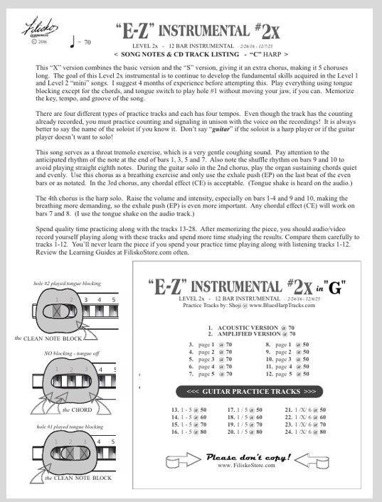 This version of the E-Z Instrumental 2 CORE will be the most difficult because it has a harmonica solo and an extra melodic variation totaling 5 choruses. (See E-Z Inst 2 to see why this song is crucial). 4 months of experience are suggested for this.