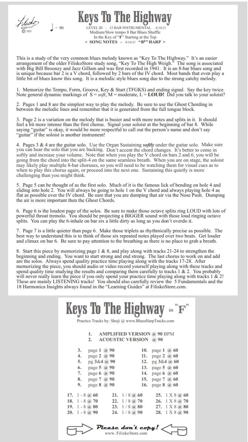 This is a study of the very common blues melody known as “Key To The Highway.” It’s an easier arrangement of the older FiliskoStore study song, “Key To The High Weigh.” The song is associated with Big Bill Broonzy and Jazz Gillum and was first recorded in 1941. It is an 8-bar blues song and is unique because bar 2 is a V chord, followed by 2 bars of the IV chord. Most bands that even play a little bit of blues know this song. It is a melodic style blues song due to the strong catchy melody.